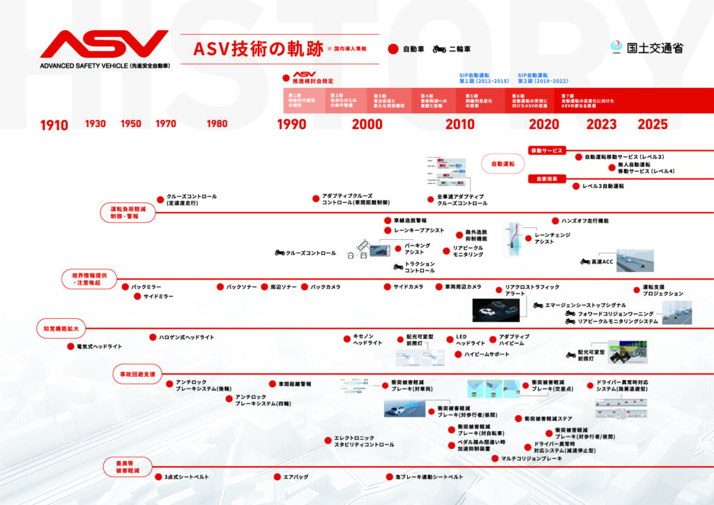 そんなASV技術の100年にも渡る軌跡をまとめたパネルが昨年秋に行われたジャパン・モビリティ・ショー2025の国土交通省ASV推進計画のブースに展示され、多くの来場者が熱心に見入っていました。ご自分の昔の愛車を思い出し、「あぁ、これついてた!」と、当時の最先端の技術自慢も。皆さんもぜひ、「ASV技術の軌跡」をチェックしてみてください。