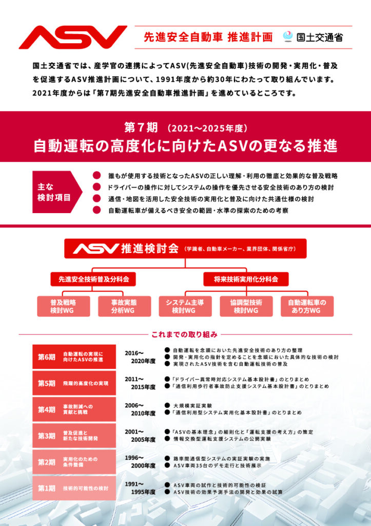 国土交通省の「ASV推進計画」の概要を紹介しています。交通事故削減のための普及戦略など、第7期(2021–2025年度)の重点項目をまとめています。