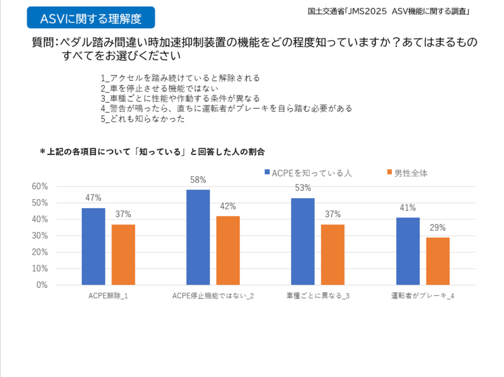 次に、それぞれの技術の機能限界や正しい使い方について聞いてみました。すると、技術について「知っている」と答えた人は、その技術の機能限界や正しい使い方についても認知度が高いという結果が出ました。特に、まだ全体としては技術自体を知っている人が約半数だったACPEやACCについて、技術を「知っている」人のグループと男性全体を比較すると、技術の機能限界や正しい使い方についても認知度は「知っている」グループが大きくリードしていました。ここは「やっぱりね」です。ただし、「え、そうなの?!」という結果も。