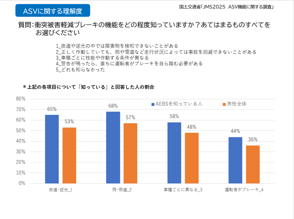 まずは、ASV技術についての認知を聞いた質問では、衝突被害軽減ブレーキ(AEBS)が最もよく知られており、認知度は65%となりました。AEBSは、国内ではすべての新型乗用車に搭載が義務付けられているので、認知度が高いと考えられます。