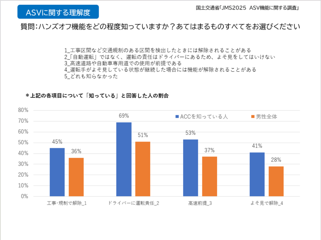 ハンズオフ機能の機能限界や正しい使い方についても聞いてみました。こちらは、ACCについて「知っている」グループを見てみると、男性全体の値と比べて、機能についての認知度が大幅に高いとの結果が出ました。これも「やっぱりね」です。質問の中に「ドライバーに運転責任がある」という項目がありますが、この認知度が「ACCを知っている」グループでは7割に達しました。これは、筆者にとっては「え、そうなの?!」と思うほど高い結果でした。なぜなら、AEBSやACPEでは、同じく基本的な質問として「ドライバーがブレーキを踏む」ことを知っている人が4割に留まったからです。背景としては、ハンズオフという、登場して間がない最新技術では、まだシステムに依存することなく、ドライバーに運転意識があることが考えられます。今後、普及が進んでもこうした意識が縮小しないよう、さまざまなコミュニケーション策が大切で、これは発信側の私たち「Drive Safe!」一同が心に刻んでおきます。皆さんも、「ハンズオフでもドライバーに運転責任がある」ということを覚えておいてくださいね。